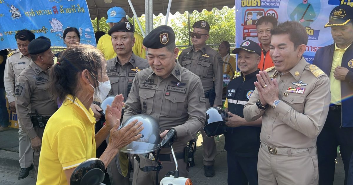 และได้แจกหมวกนิรภัยฯ แก่ประชาชนที่ขับขี่รถจักรยานยนต์ตามนโยบายสำนักงานตำรวจแห่งชาติ